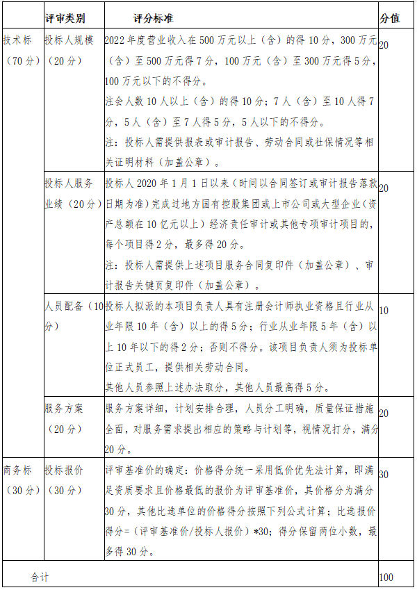本項目采用綜合評標法,由產(chǎn)控集團評標小組對各投標人技術標和商務標進行綜合評審和評分。評分采用百分制,按總得分(技術標得分與商務標得分之和)從高到低的順序確定排名次序,總得分排名第一的投標人為中標人;如遇兩家投標人總得分排名并列第一時,則商務標得分高的投標人為中標人;如商務標得分一致,則通過抽簽方式確定中標人。技術標最終得分為所有評委評分的算術平均值,評分值均保留至小數(shù)點后兩位。 具體評分標準如下: